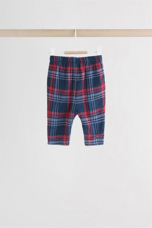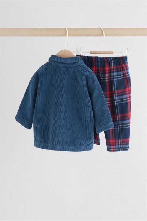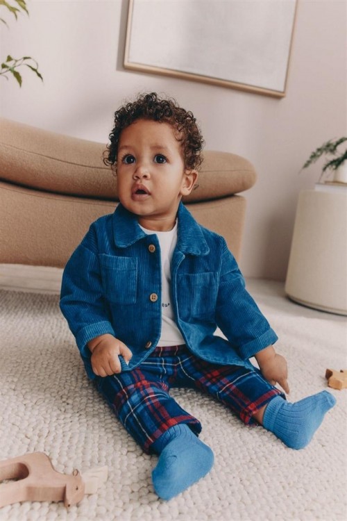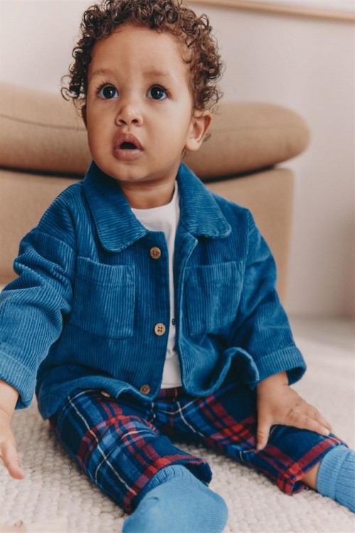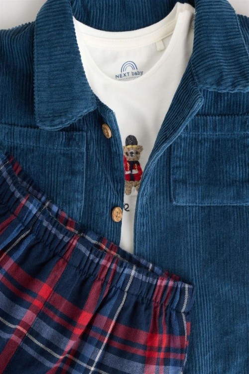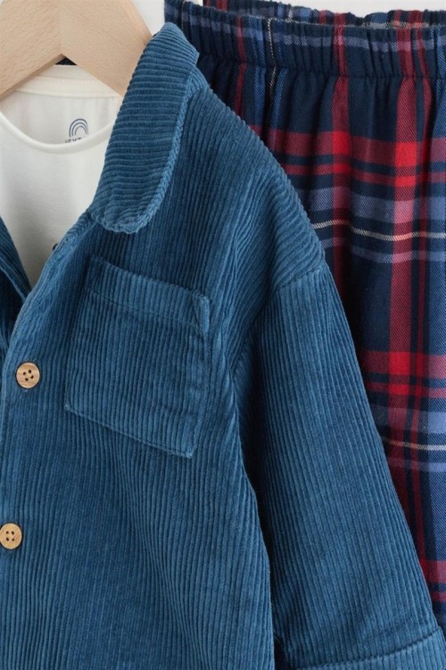 Трилентов комплект, включващ кремаво блузче, тъмносиня кадифена шърт-яке с предни джобове и удобен каре панталон в червено и тъмносиньо. Мек, стилен и идеален за ежедневието.