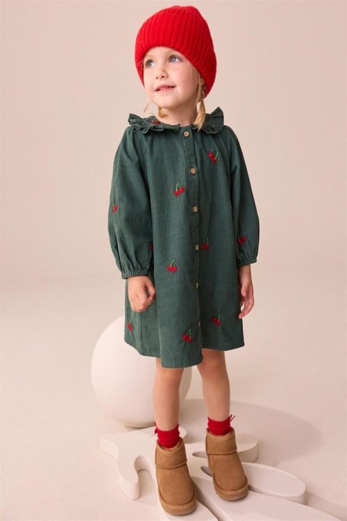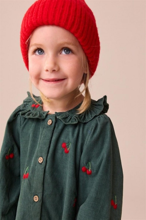 Сладка тъмнозелена кадифена рокля, украсена с малки бродирани черешки. Тя се отличава с дълги бухнали ръкави, яка и копчета отпред за очарователен, класически вид.