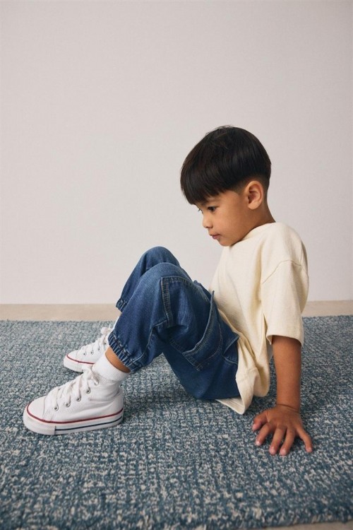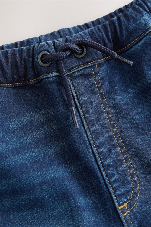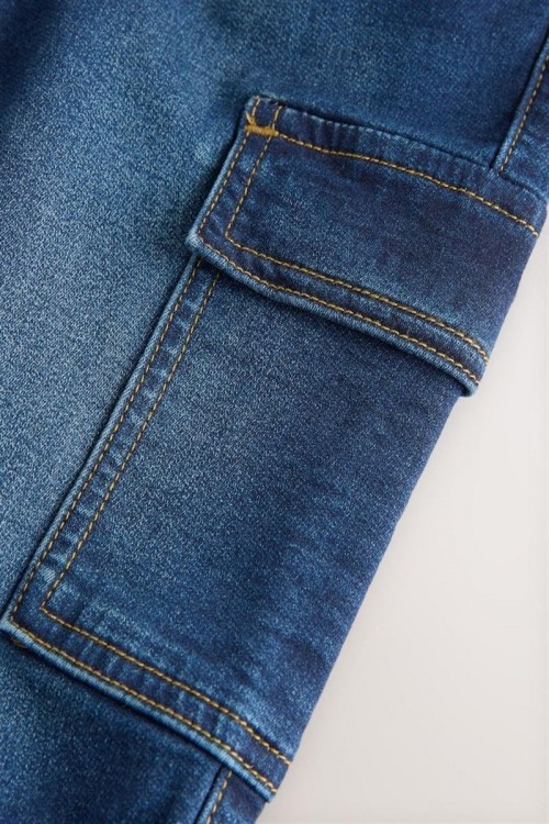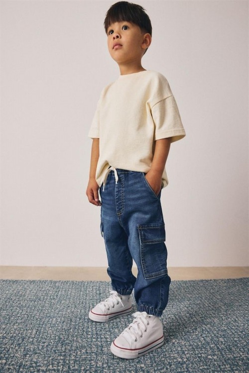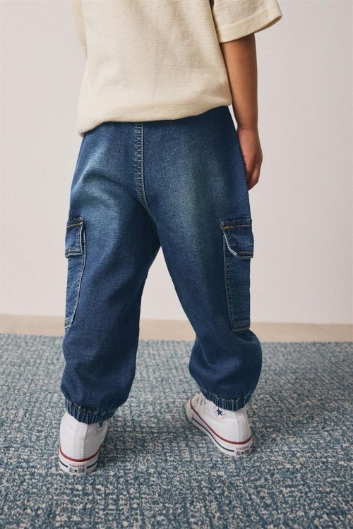 Ежедневни сини дънки, тип карго с големи странични джобове, удобна ластична талия и ластични крачоли. Практични и идеални за детските приключения.