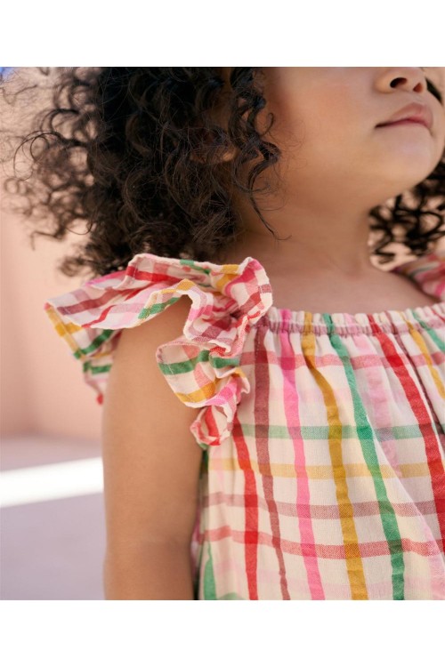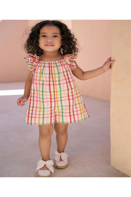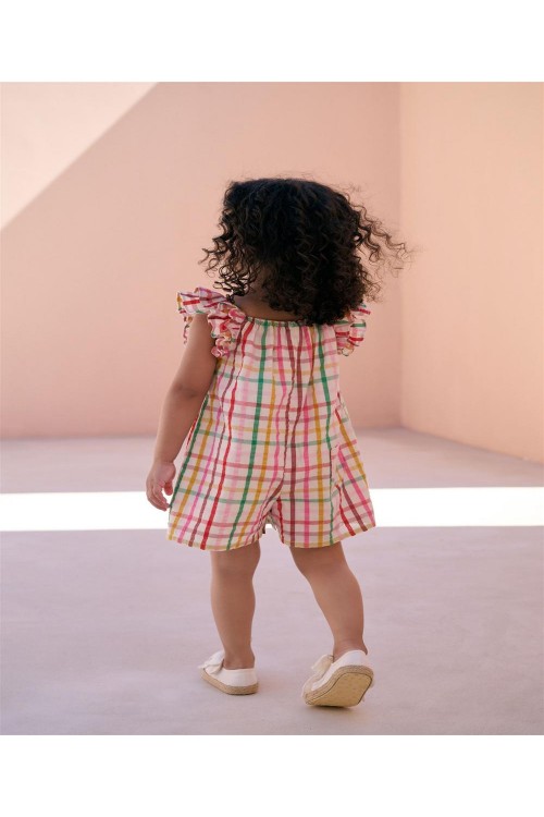 Памучният гащеризон за вашето момиче е сладко и удобно допълнение към гардероба ѝ. Моделът се облича лесно, с къдрички и еластично деколте за удобно прилягане.