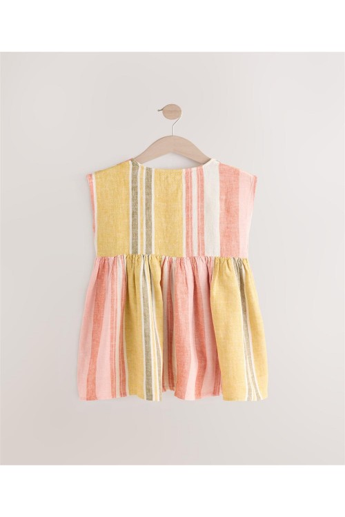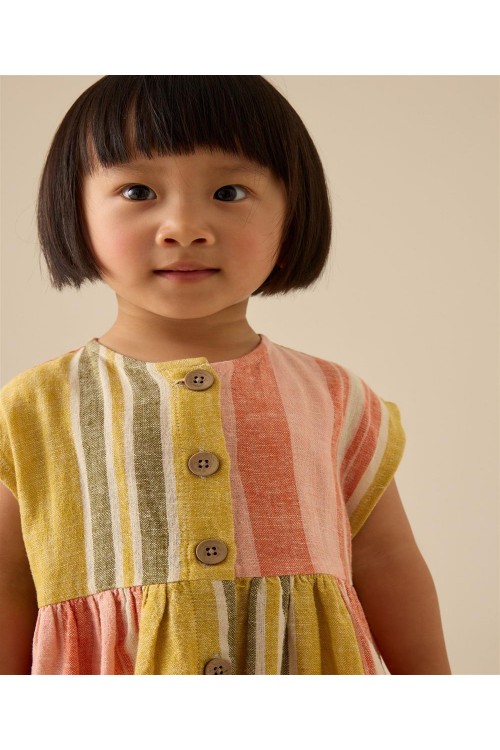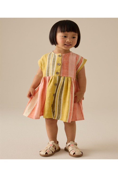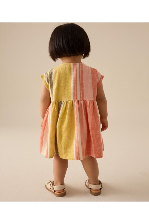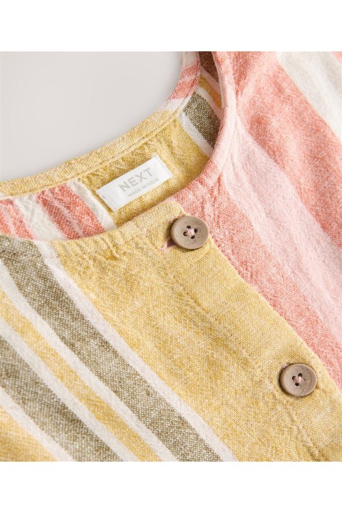 Тази красива рокля с копчета с жълто и розово райе е лесна за носене, с елегантен, но небрежен външен вид, който е идеален както за партита, така и за ежедневно носене. Роклята е изработена от богата на памук смес с добавен лен, завършена с памучна подплата за комфортно усещане.