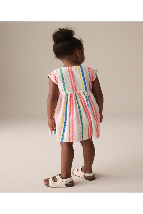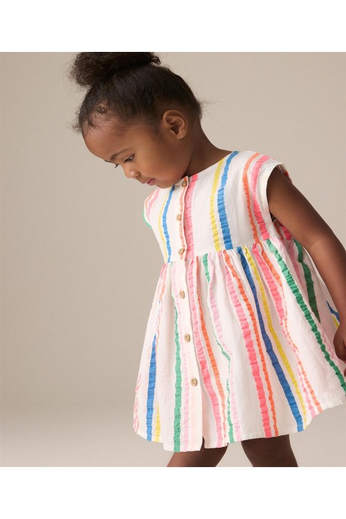 Тази рокля с копчета и шарени райета е лесна за носене, с елегантен, но небрежен стил, който е идеален както за партита, така и за ежедневно носене. Роклята е изработена от богата на памук смес, с добавен лен.