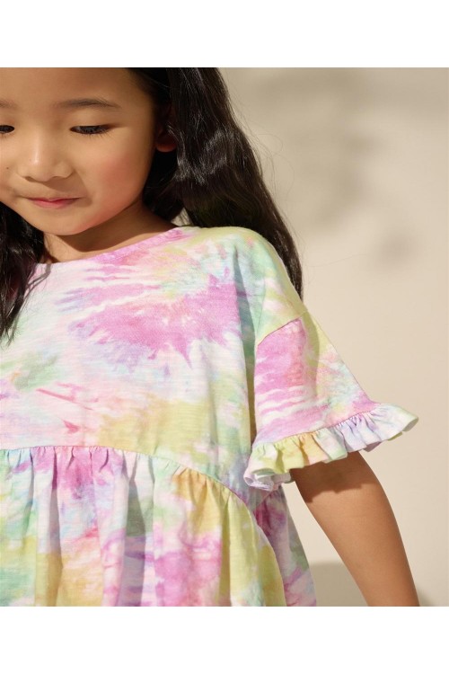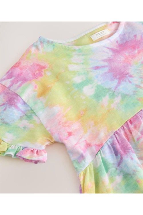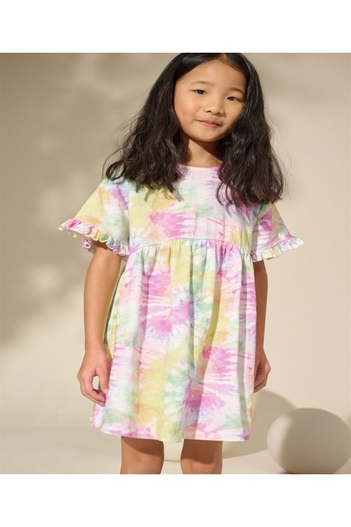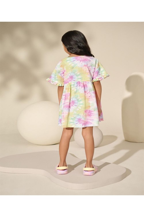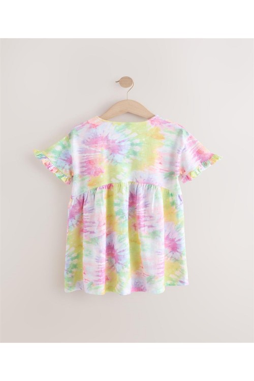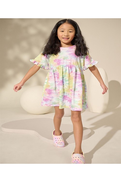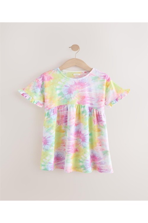 Тази удобна рокля от чист памук е с многоцветна щампа, включваща обло деколте и детайли по късите ръкави, идеална за ежедневно носене или партита.