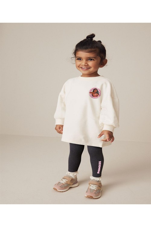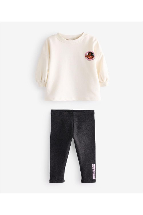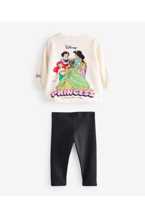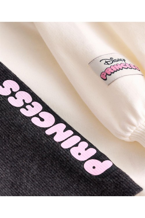 Този очарователен комплект с принцеси на Disney е перфектен за малки почитатели на приказките! Включва удобен бежов суитшърт с любимите принцеси Ариел, Тиана, Жасмин, Снежанка и Рапунцел, както и думата "PRINCESS" в смели розови букви. Комплектът е завършен с удобен черен клин, идеален за ежедневна употреба, игри или разходки. Мек, стилен и перфектен за всяко дете, което обича Disney!