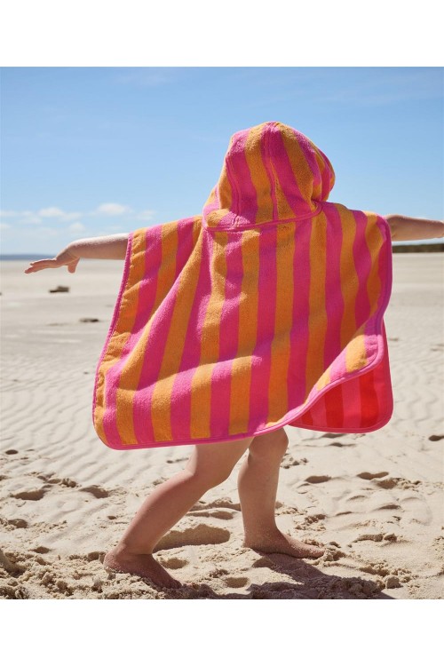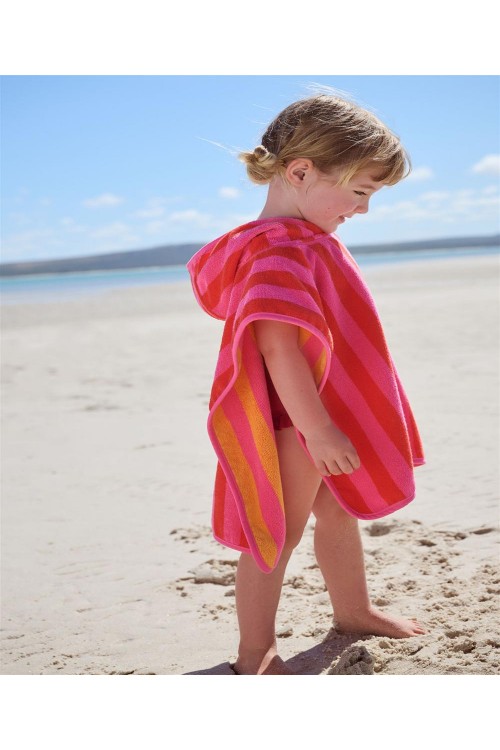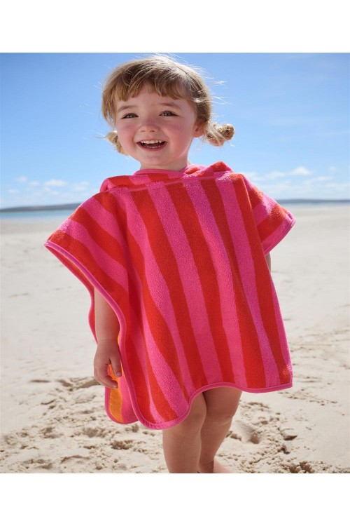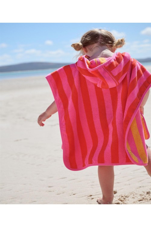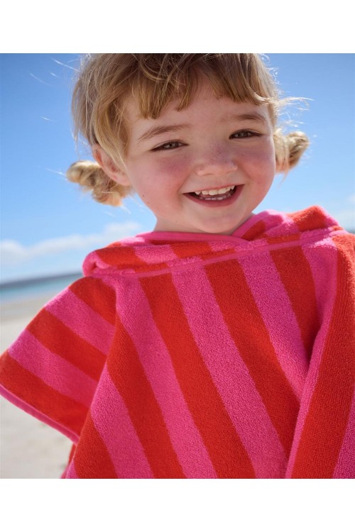 Чудесно за подсушаване след плуване, това пончо от чист памук в червено и розово има двулицев дизайн с качулка, завършен с текстурирана хавлиена материя.