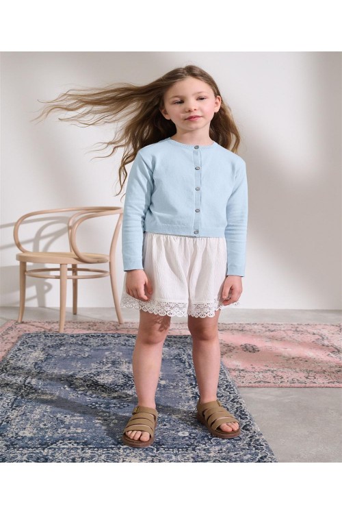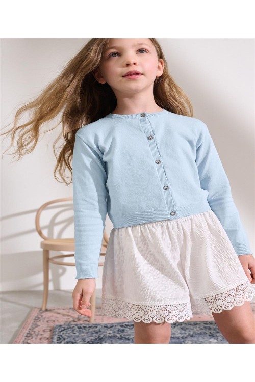 Изработена от плетена материя с високо съдържание на памук, тази синя жилетка е с копчета и обло деколте.