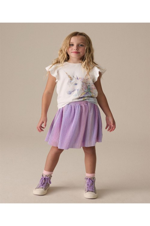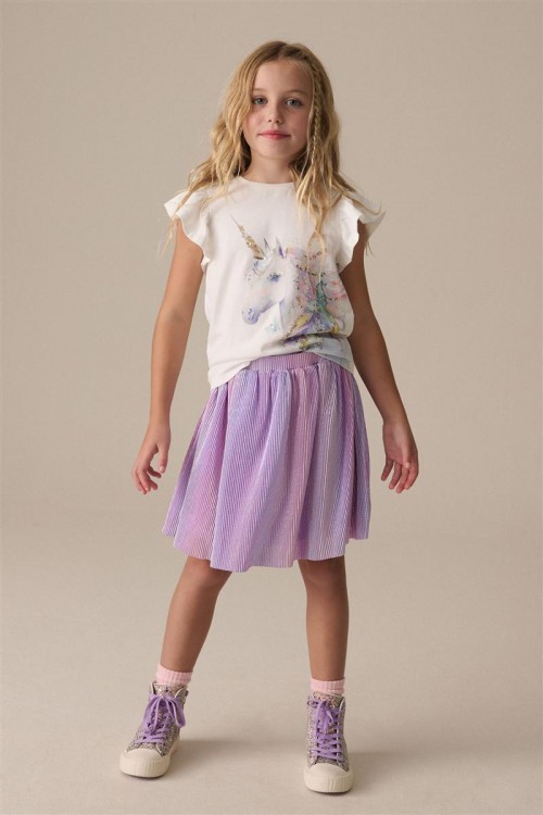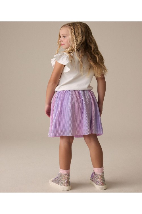 Тази очарователна пола ще добави малко магия към техните ежедневни тоалети, включвайки цял раиран многоцветен принт със сребърно и лилаво, еластична талия за лесно обличане и удобна памучна подплата.