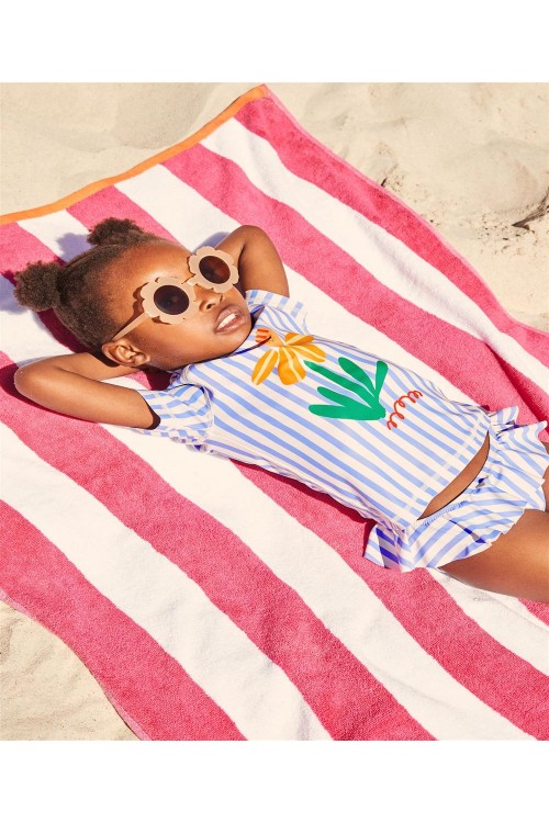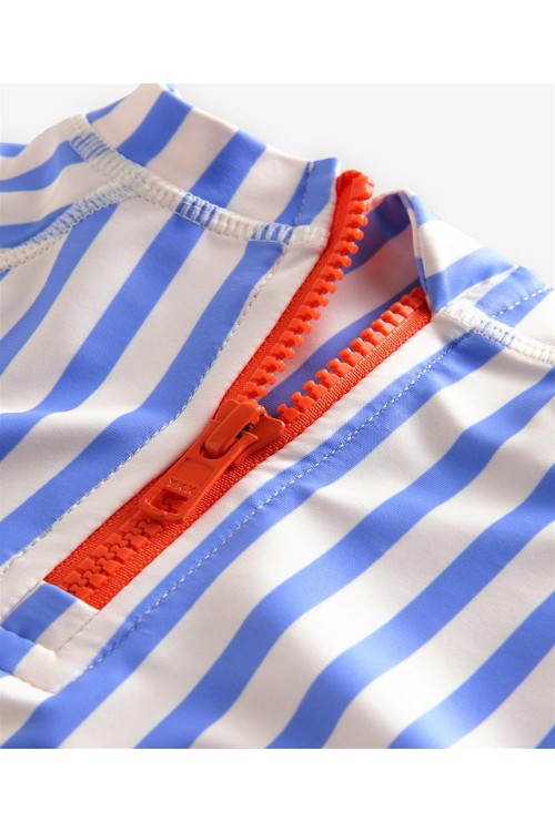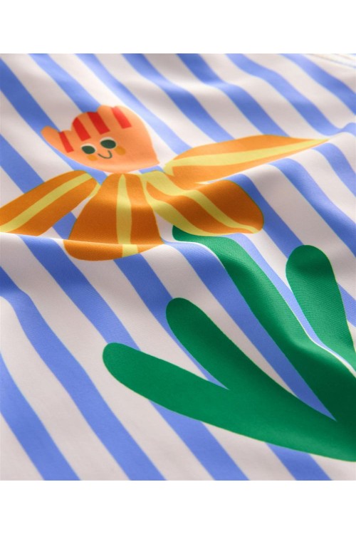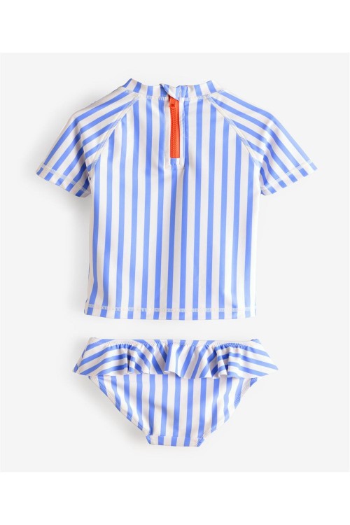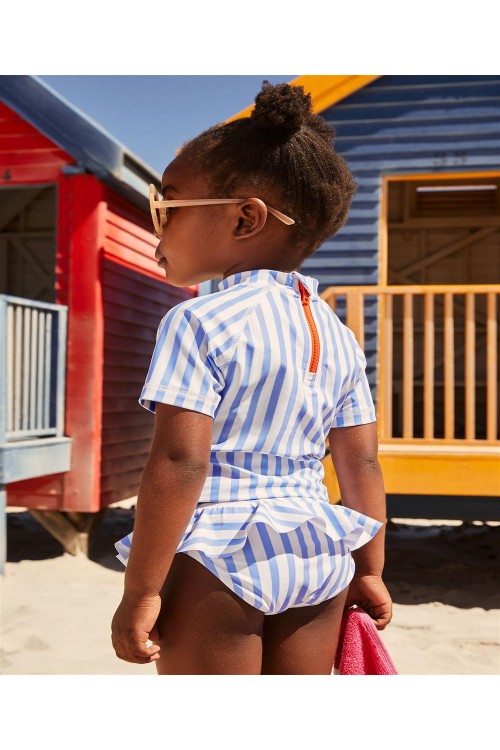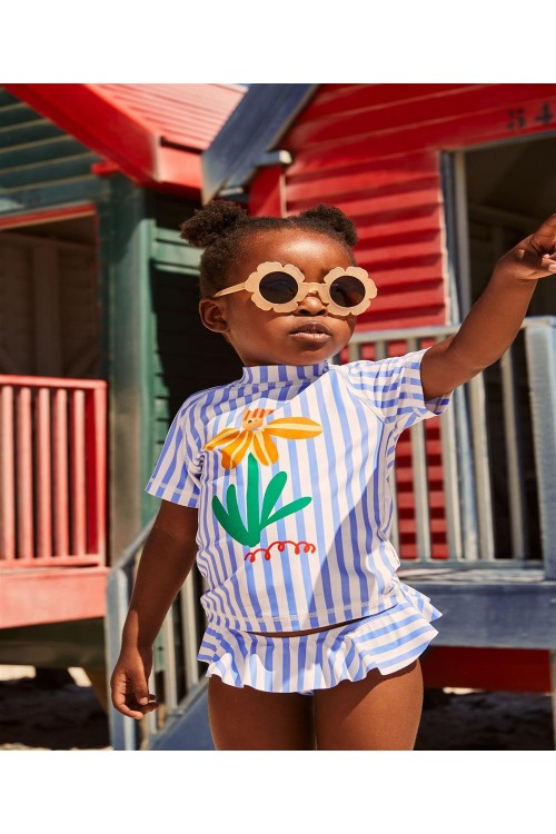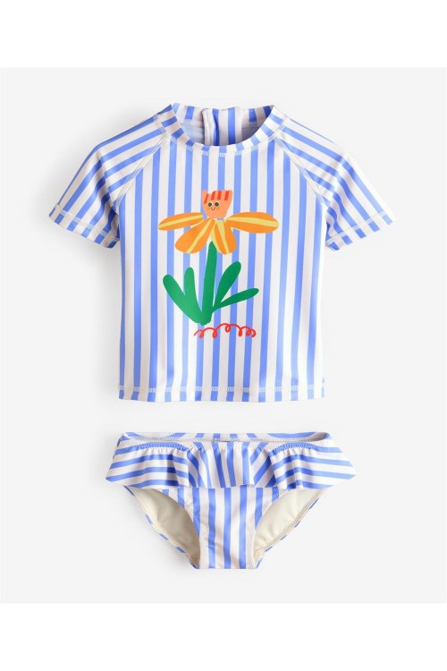 Този плажен комплект от 2 части на сини райета, включва блуза с къс ръкав с флорален мотив и закопчаване с цип отзад за размери до 12-18 месеца за лесно обличане, заедно с чифт сладко долнище. UPF рейтинг 50+.