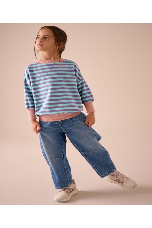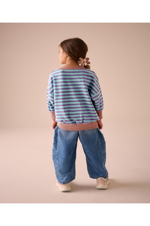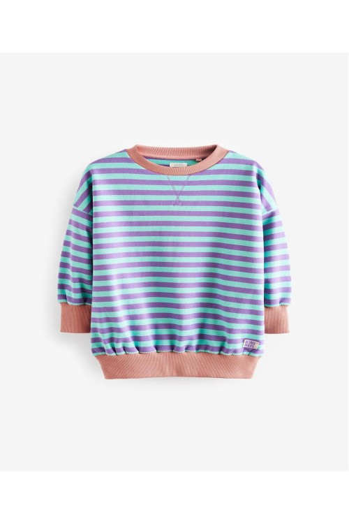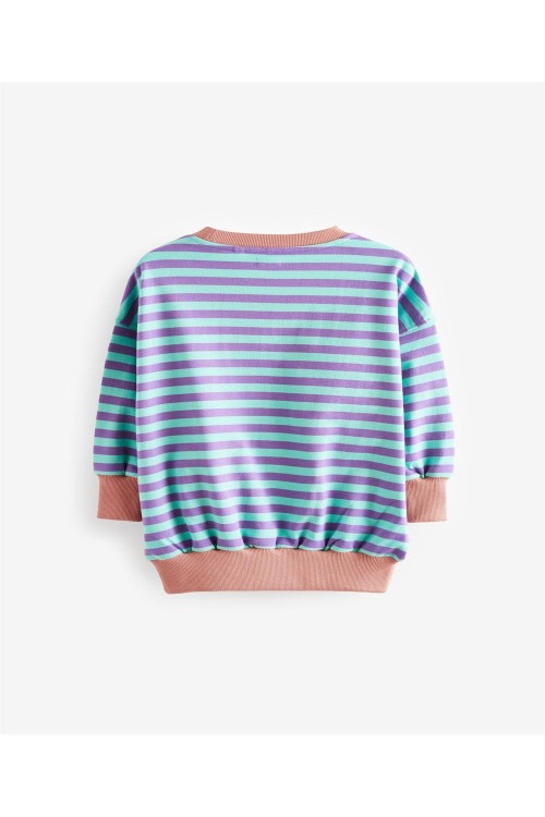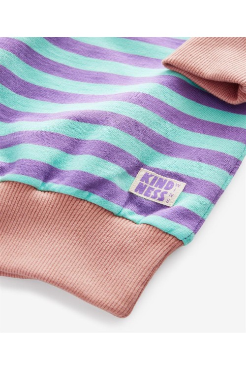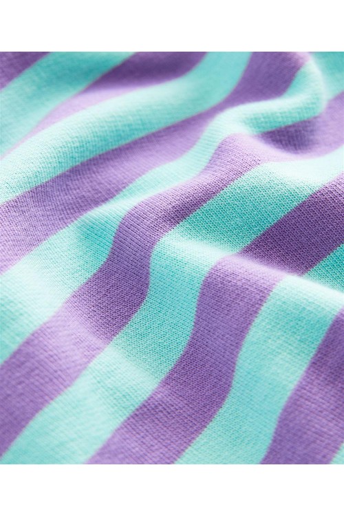 Този стилен свободен суитшърт се отличава с игрив десен на райета в пастелно лилаво и ментово зелено, допълнен с меки прасковени маншети и подгъв. Създаден за удобство и свободна кройка, той е идеален както за ежедневни разходки, така и за уютни дни у дома. Изработен от висококачествена материя, гарантира топлина и издръжливост