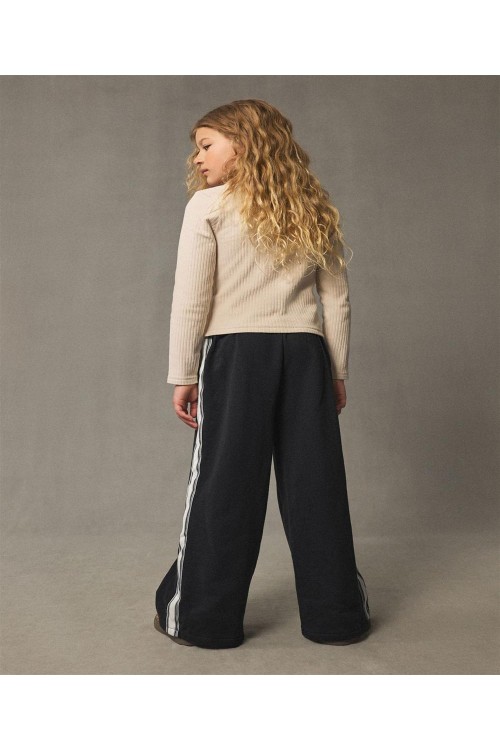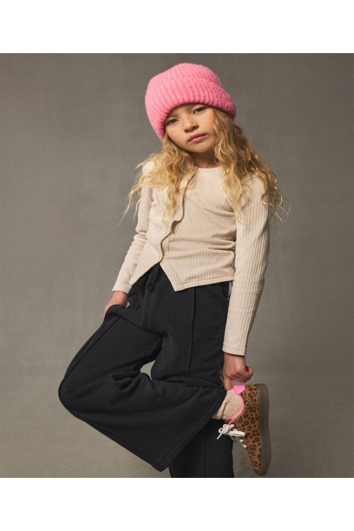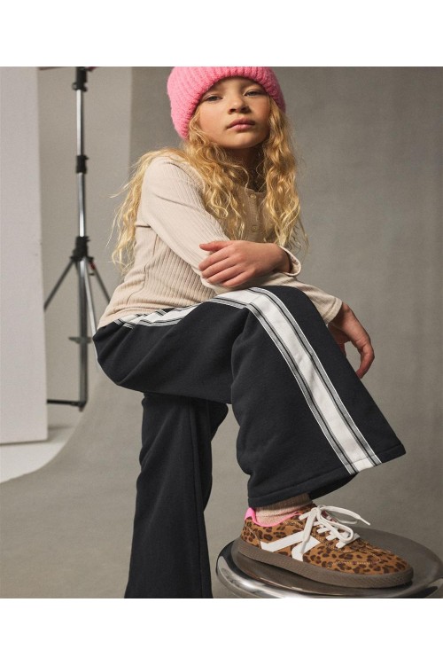 Тя ще хареса тези стилни и уютни долнища, с широка кройка, с ръб посредата и странични райета, завършени с регулируема ластична талия и странични джобове. Може да се пере в пералня.