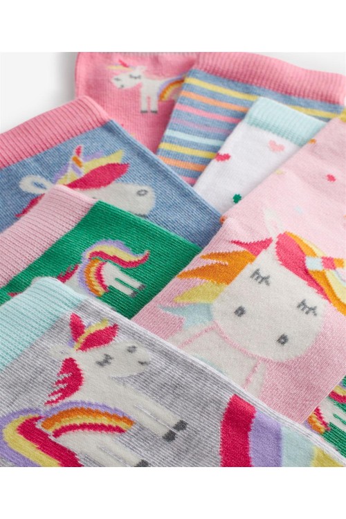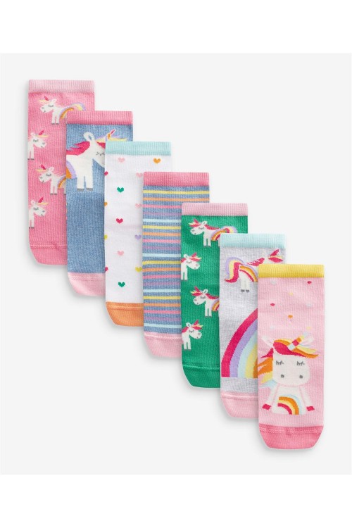 Запасете се с най-важните неща за ежедневието на вашите момиченца с този комплект от 7 чифта шарени чорапи с еднорози до глезена от удобна памучна материя.