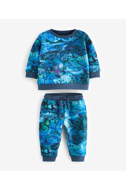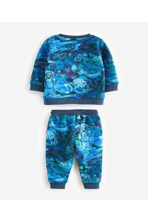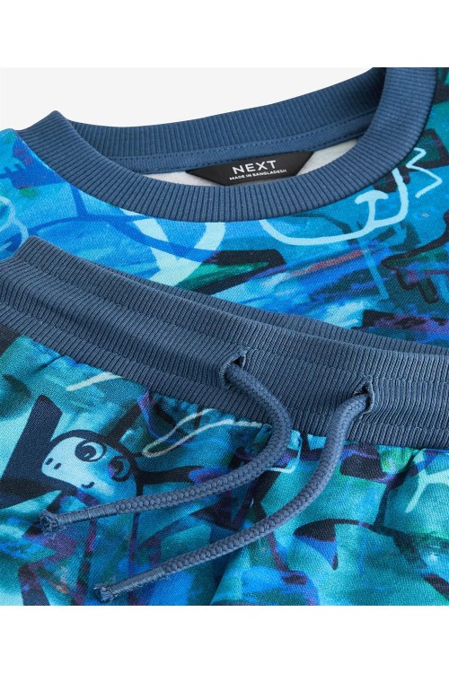 Добавете смел стил в гардероба на вашето дете с този син екип с графити. Включва блуза с принт и съчетан панталон тип джогър, изработени от мека материя за целодневен комфорт и впечатляваща визия.