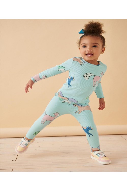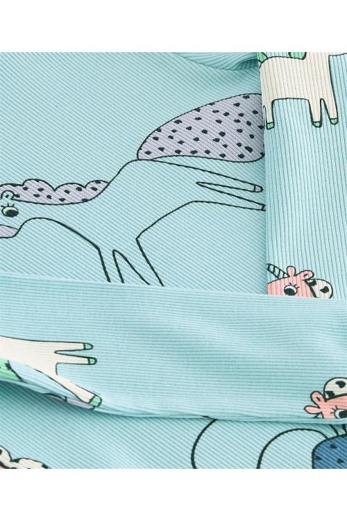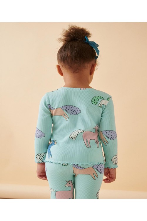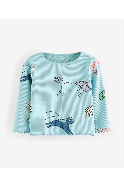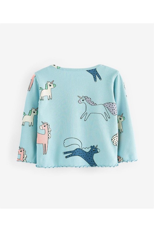 Тази очарователна рипсена блуза с дълъг ръкав в синьо има забавен принт с еднорози, което я прави вълшебно допълнение към гардероба на всяко дете. Вълнообразният подгъв добавя чаровен акцент, а удобната материя гарантира комфорт през целия ден. Идеална за ежедневни приключения.