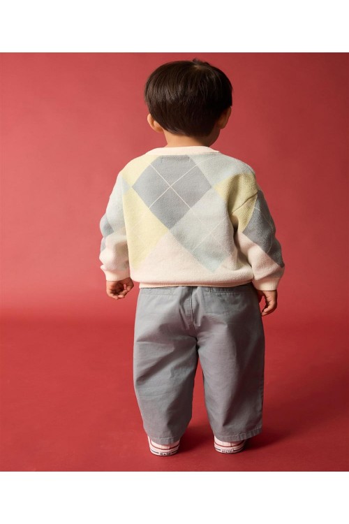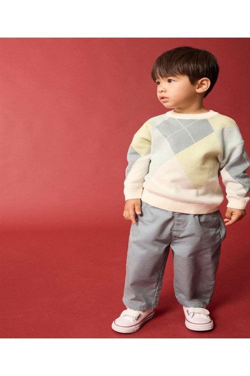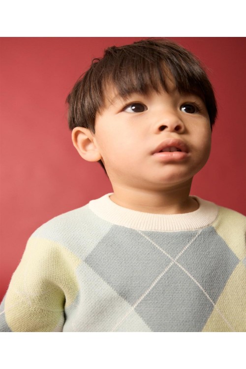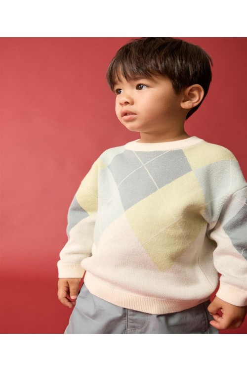 Този стилен и уютен пуловер е незаменим елемент в гардероба на вашия малък джентълмен. Универсалният му дизайн го прави перфектен за всякакви поводи, като лесно се съчетава с дънки или панталон. Изработен от мек памук. Пастелните цветове допринасят за приятната визия.