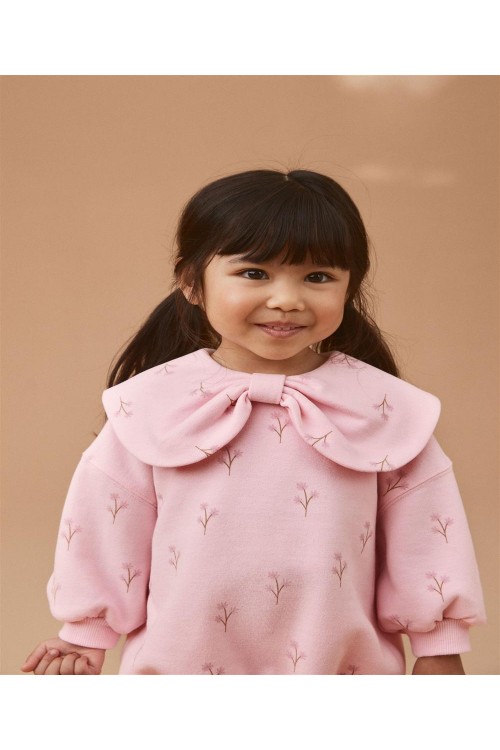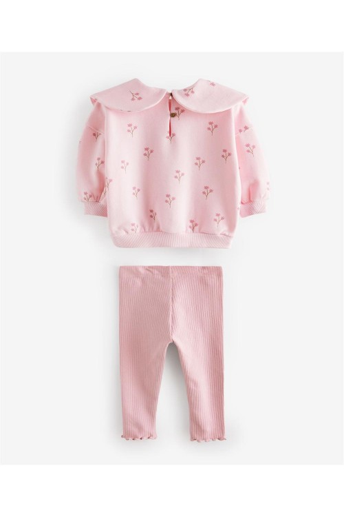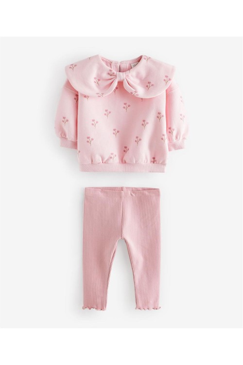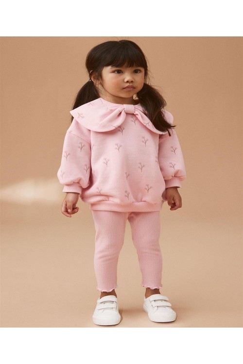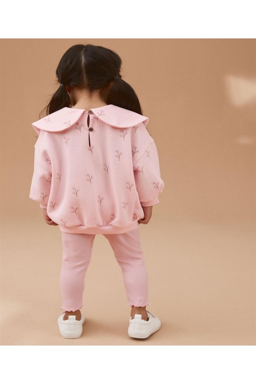 Мек и стилен, този очарователен розов комплект включва удобен суитшърт с нежна флорална бродерия и голяма панделка на яката, комбиниран с рипсен клин за максимален комфорт. Еластичните маншети и удобната кройка осигуряват лекота на движение, а меката материя поддържа детето топло и уютно. Идеален избор за ежедневието или специални поводи.