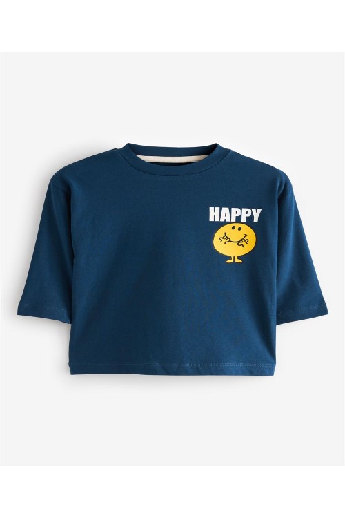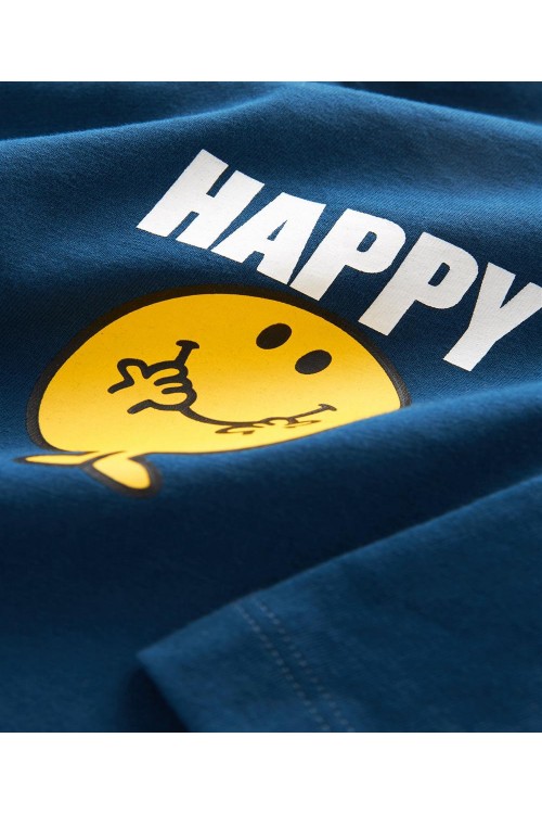 Синя блуза с обло деколте и дълги ръкави. Щампа на усмихнато човече и надпис HAPPY. Съчетайте с анцуг, дънки и маратонки.