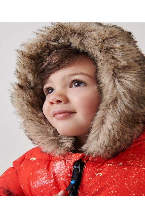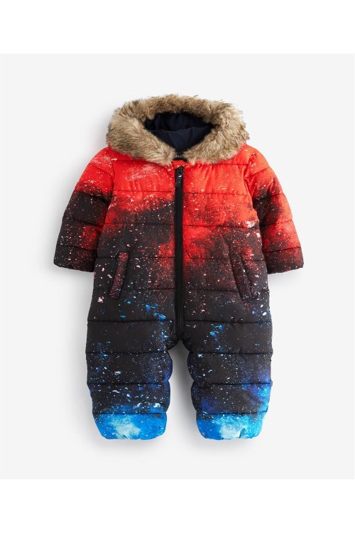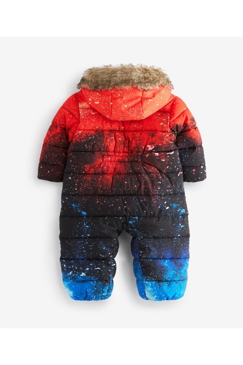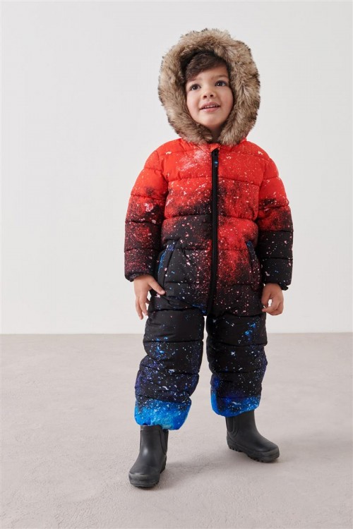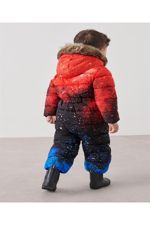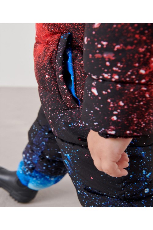 Този ярък космонавт впечатлява с ефектен галактически принт, преминаващ от огнено червено към наситено синьо с фини „звездни“ пръски. Напълно подплатен е за топлина и комфорт, идеален за студени зимни дни. Разполага с цип отпред за лесно обличане и качулка с мека изкуствена пухкава кантировка за допълнителна защита.