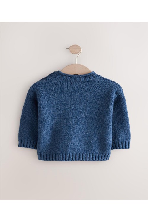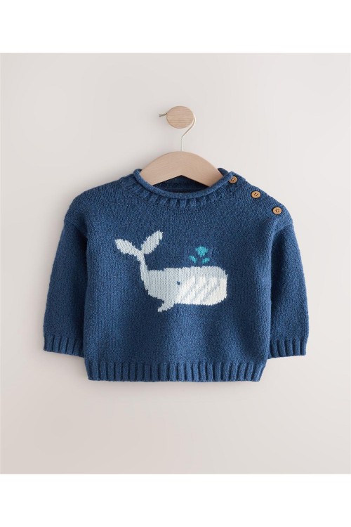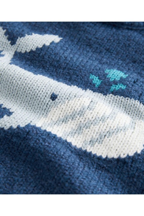 "Сладък и уютен, този плетен пуловер от памучна смес е с очарователен дизайн на кит, с вдъхновено от рибарите деколте и детайли от копчета на рамото, завършен с оребрени краища