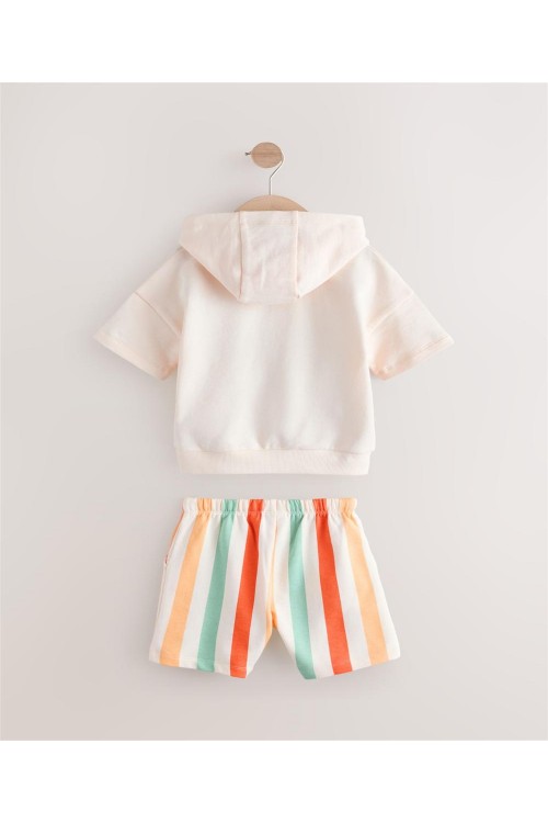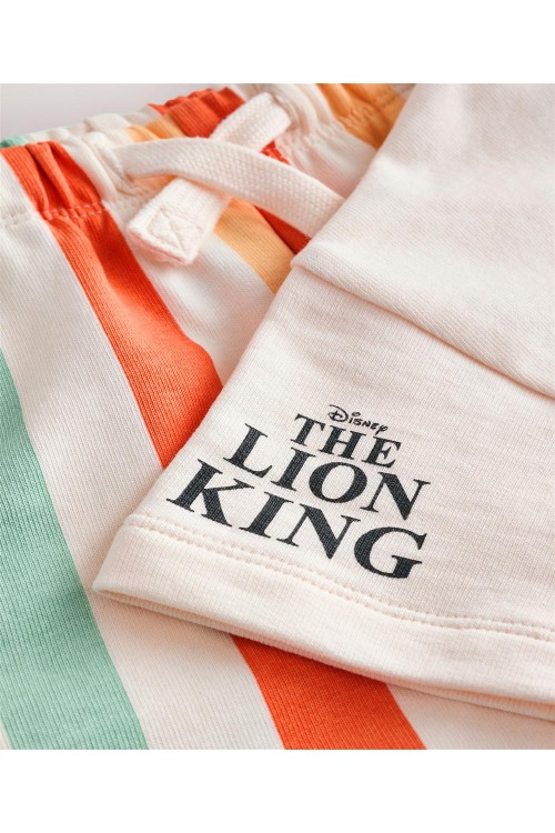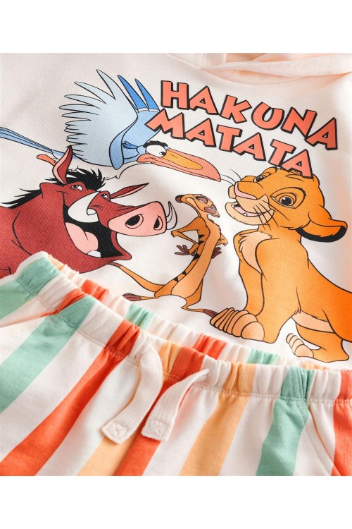 Кажете Hakuna Matata с този комплек. Памучно горнище с качулка с къс ръкав , украсено със забавна графична щампа на Цар Лъв и еластични къси панталони с динамичен дизайн на райета.