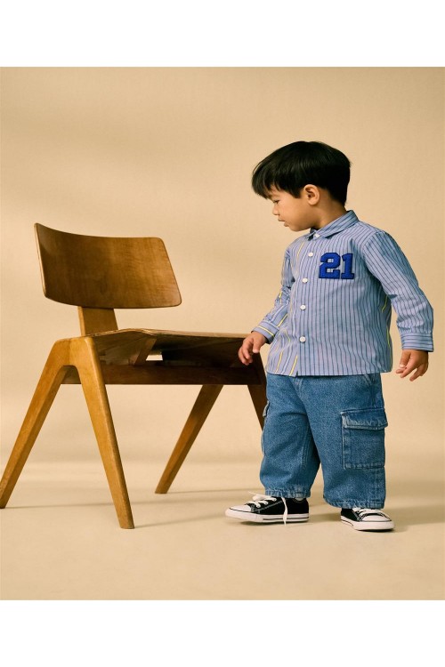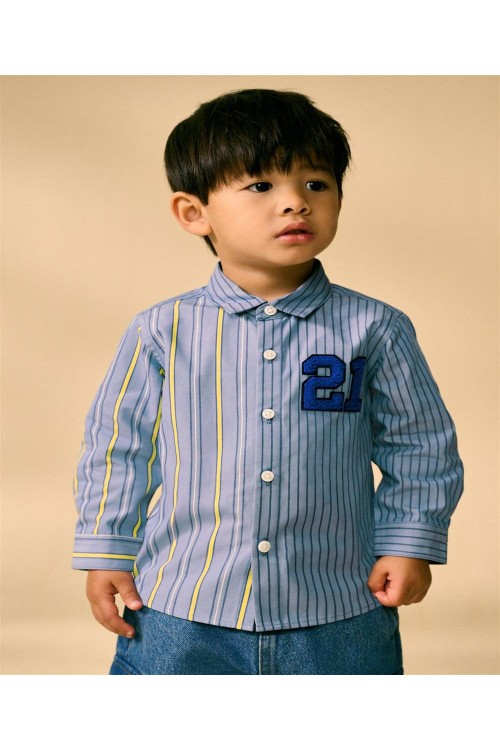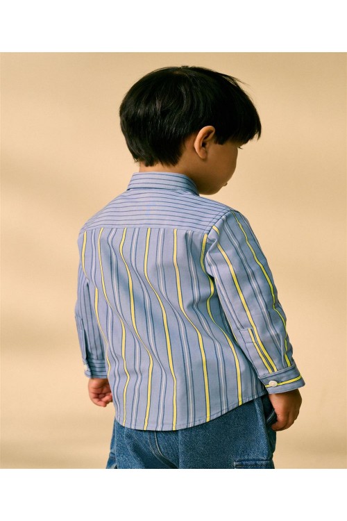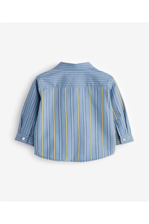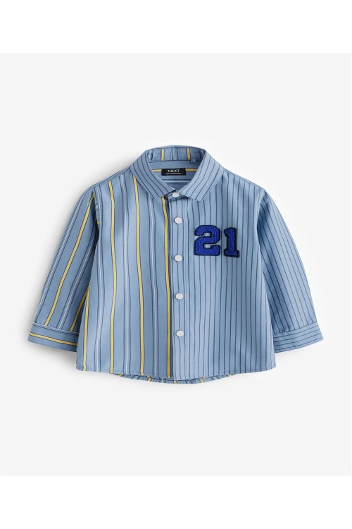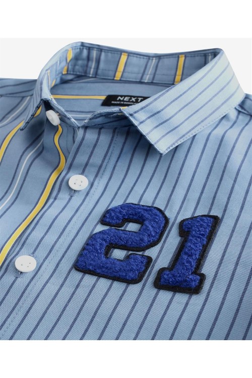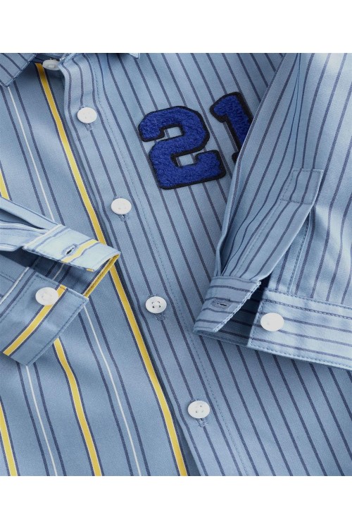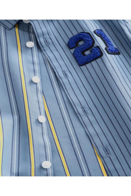 "Тази риза е изработена от чист памук, със синьо и жълто райе, закопчаване с копчета и класическа яка, украсена с емблема на гърдите и дълги ръкави.