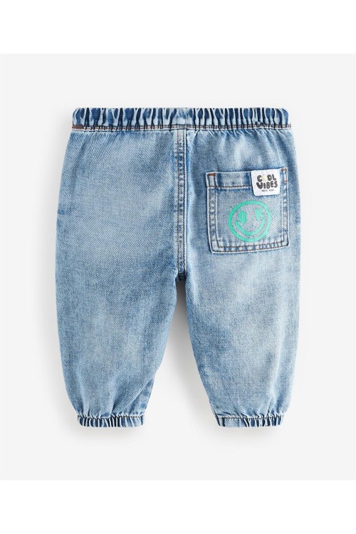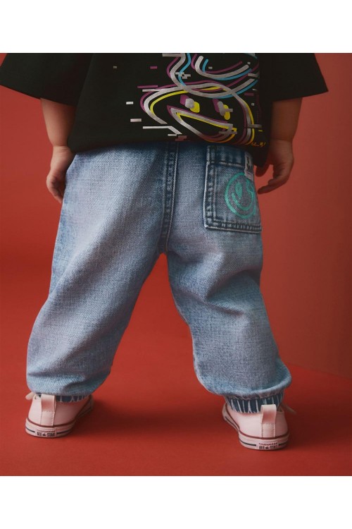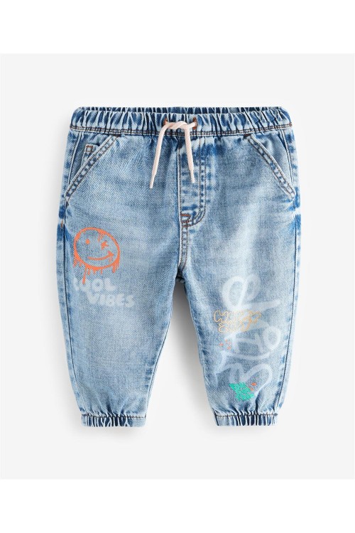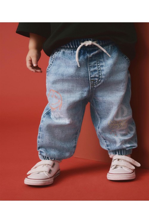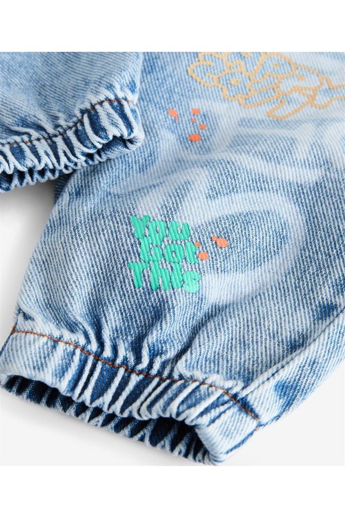 Нека вашето мъниче се изрази с тези стилни, впечатляващи дънки, изработени от светлосин деним и чист памук. Дънките имат удобна еластична талия с регулируеми връзки, графити по цялата повърхност, два странични джоба и един заден джоб.