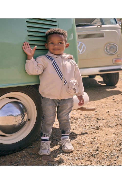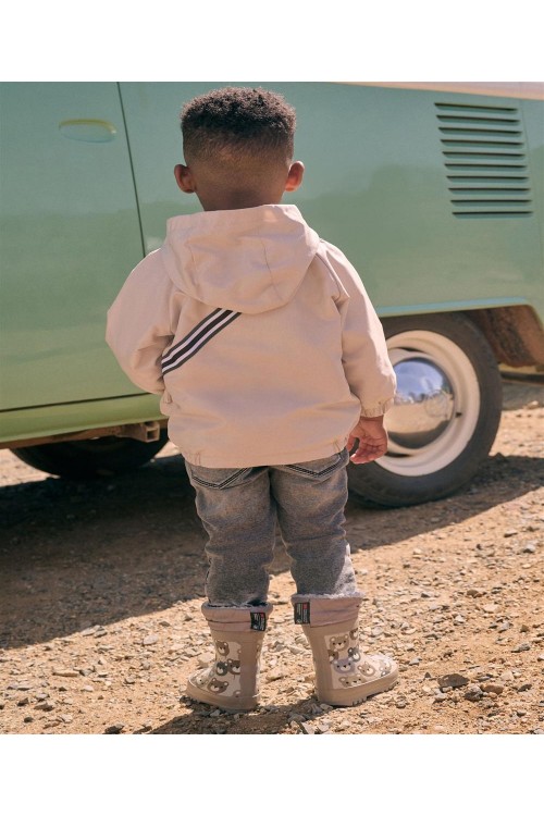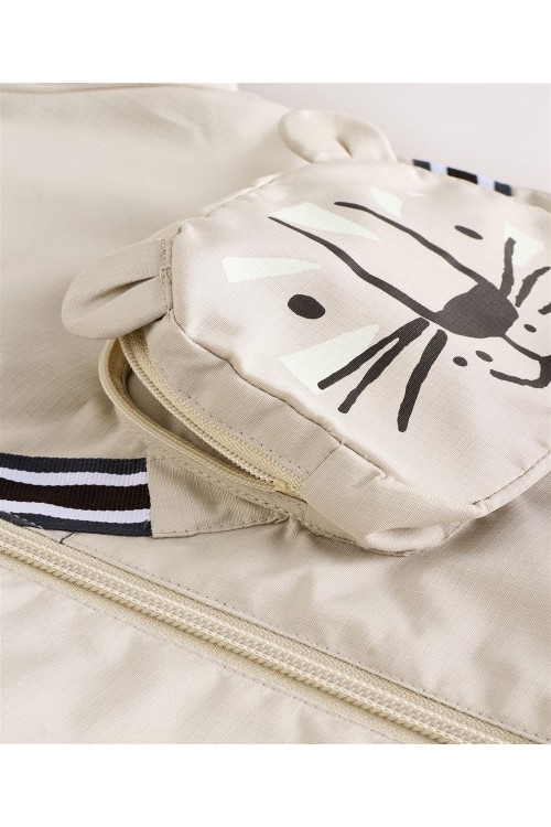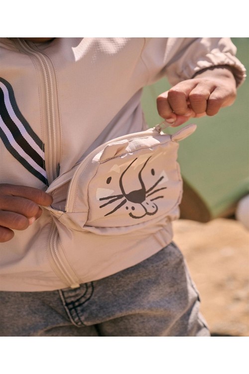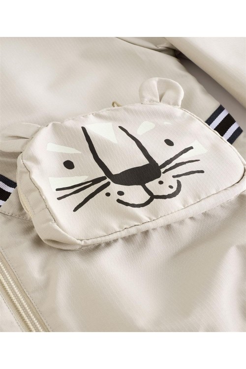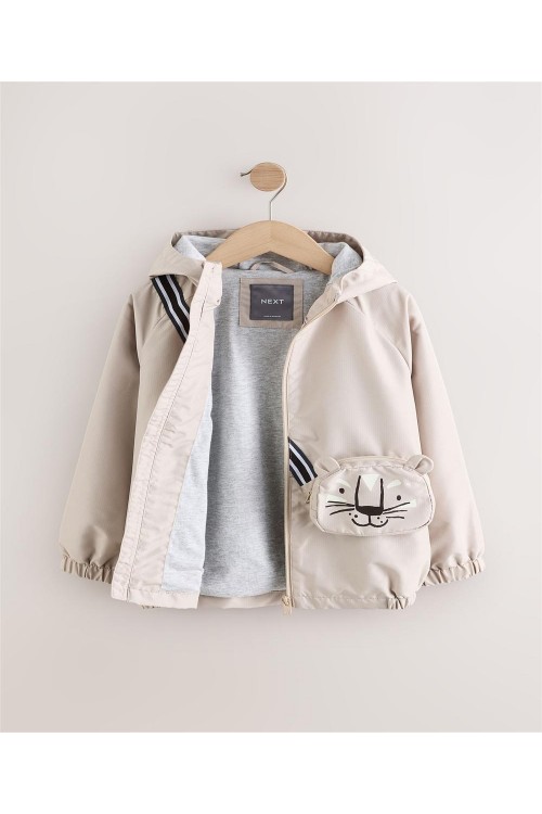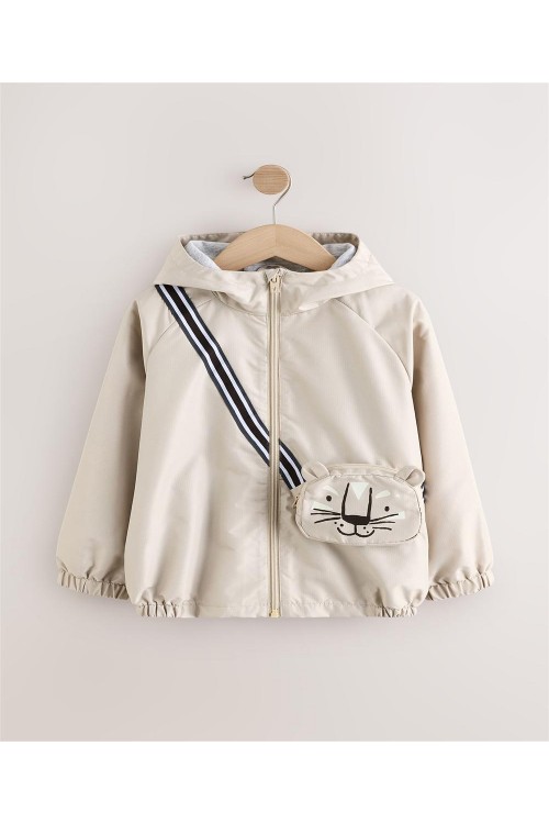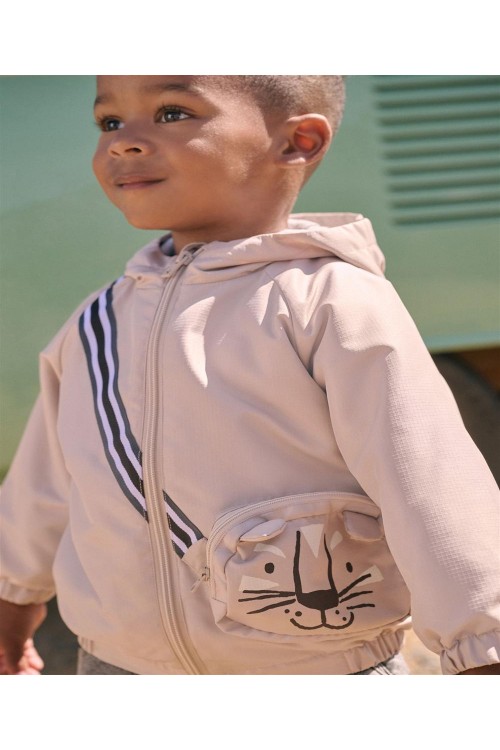 Идеално за непредсказуемо време, това кафяво леко яке е устойчиво на дъжд и удобно за приключения, разполага с вградена странична чанта с цип и дизайн с котка, мека подплата от трико, вградена качулка и еластични подгъви.