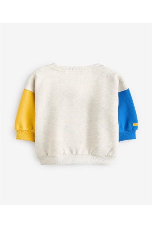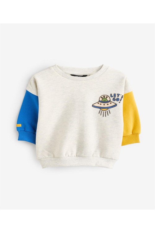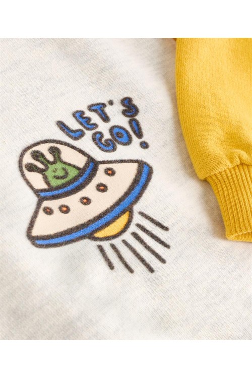 Добавете малко забавление към уютните им дрехи с този свеж суитшърт от чист памук с цветни ръкави, с принт на извънземно на гърдите.