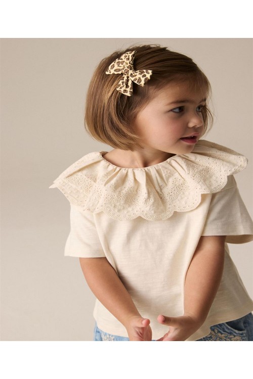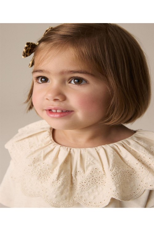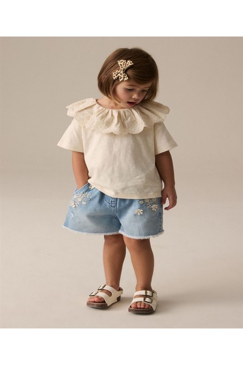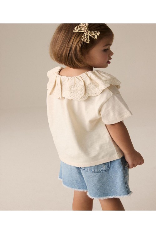 Този прекрасен кремав топ от чист памук е с къс ръкав и деликатно декорирана яка от бродерия, която придава вълшебство на всеки тоалет. Може да се пере в пералня.